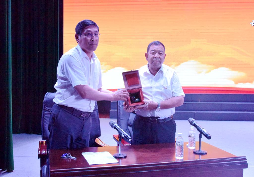 | 副校长张焕强将我校美术与设计学院学生作品漆画葫芦赠送给石春阳书记 |
