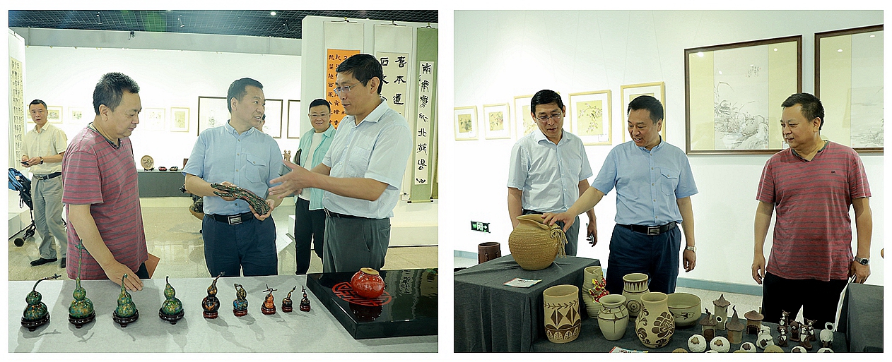 开展当日,我校副校长张焕强陪同黑河市市长谢宝禄参观展厅,市长谢宝禄在师生创作的作品前逐一观赏,并与师生亲切交谈,鼓励师生结合地方特色,创作更多具有思想性、艺术性的优秀作品。