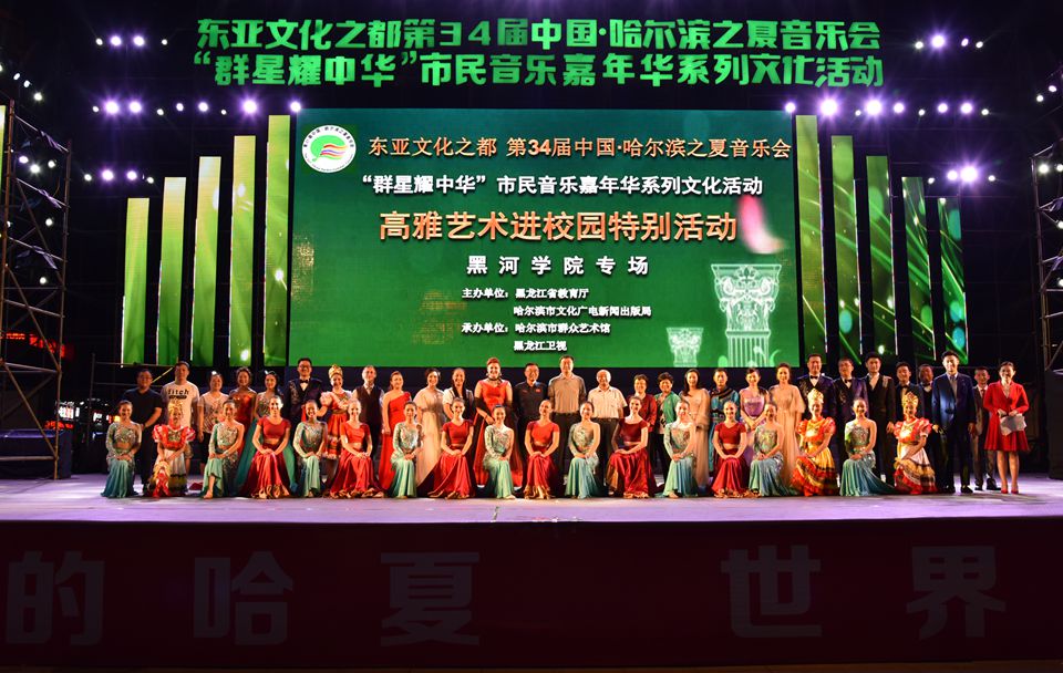 本网讯(记者 赵宇 摄影 宋国旺)展示东亚文化之都无限魅力,为第34届“哈夏”音乐会助力添彩,7月12日晚,第34届中国·哈尔滨之夏音乐会“群星耀中华”市民音乐嘉年华系列文化活动黑河学院专场演出在中央大街防洪纪念塔广场举行。本次活动作为黑龙江省教育厅高雅艺术进校园特别活动,由黑龙江省教育厅、哈尔滨市文化广电新闻出版局主办,黑龙江卫视、哈尔滨市群众艺术馆共同承办,引起社会各界广泛关注。省教育厅艺体卫处处长李向东到现场观看演出。我校党委书记王刚陪同哈尔滨体育学院党委书记曹百瑛(原黑河学院党委书记)、哈尔滨石油学院党委副书记杨宏(原黑河学院党委副书记)与现场近万名观众一同欣赏了具有中俄风情的音乐盛宴。