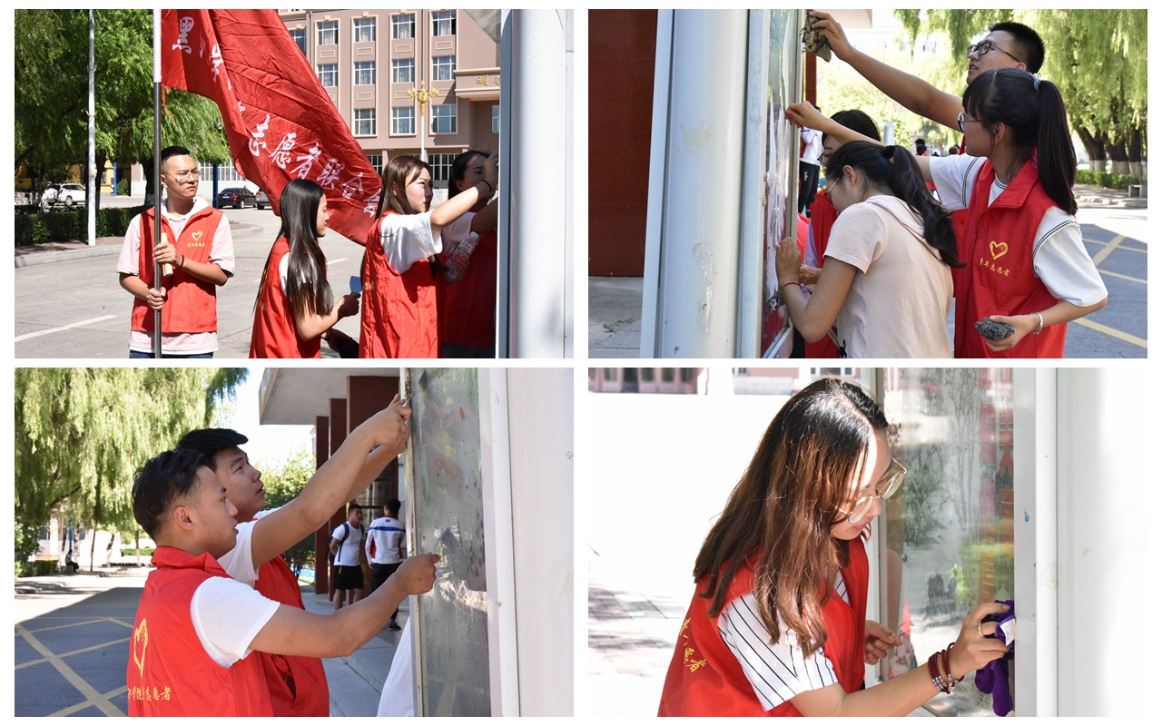 中午12点30分,志愿者们准时集合在明德楼前,利用提前准备的铲刀、钢丝刷等清洁工具,将校园内所有垃圾箱、宣传栏等场所粘贴的小广告进行彻底清理,大家分工明确,互相帮助,有条不紊,经过两天的辛勤劳动,校园环境焕然一新。
