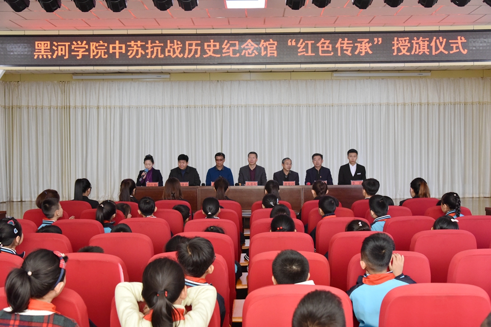 本网讯(记者 赵宇)11月7日,学校中苏抗战历史纪念馆“红色传承”授旗仪式在黑河学院附属小学五楼多功能厅举行,副校长丛喜权、远东研究院院长谢春河、中苏抗战历史纪念馆馆长崔继舟,爱辉区教体局副局长王占民、黑河学院附属小学校长马书彬及中苏抗战历史纪念馆爱国者社团讲解员、附属小学小讲解员百余人参加授旗仪式。附属小学副校长毕红梅主持会议。