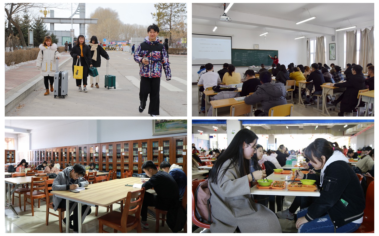 为迎接新学期的到来,在学校领导的精心安排部署下,全体教职员工提前步入各自工作岗位,履职尽责,投入到繁忙的工作当中,开好局,起好步,为学生返校做好各项准备工作;开学第一堂课上,教师们备课认真充分,提前到达教室,时而板书,时而走下讲台,课程讲得神采飞扬,同学们听得聚精会神;各学院的辅导员们也早早来到教室,检查学生们的出勤情况及上课状态,并与任课老师沟通学生情况;静谧了一个寒假的自习室,再次恢复了往日的人气,开学第一天,图书馆里迎来了新学期的首批读者,返校的同学沉浸在馥郁的“书香”中;食堂的人气指数也一下子飙升了起来,同学们在结束了寒假之后,再次欢聚在一起,就餐的同时,少不了相互之间的新年祝福和对新学期的憧憬,气氛显得更加热烈。