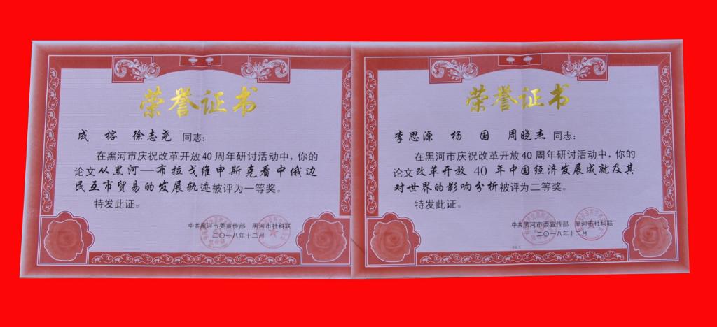 本次评选活动,全市共有20多家单位参加,百余篇征文作品参与评比,我校积极开展遴选,共推荐理论文章8篇,经过全市初评、专家复评、评委会审定,共有10余项作品获奖。我校教师成榕、徐志尧的论文《从黑河—布拉戈维申斯克看中俄边民互市贸易的发展轨迹》获一等奖;李思源、杨国、周晓杰的论文《改革开放40年中国经济发展成就及其对世界的影响分析》获二等奖。