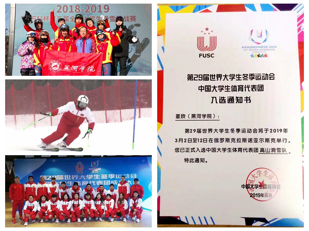 “能在毕业前作为黑河学院学子,代表中国与世界大学生同台竞技,让我感到荣幸而激动。”董欣说:“从最初的选拔到成为中国大学生高山滑雪代表团的一员,从在校期间的日常训练到比赛前的集中训练,我学到了许多,也成长了许多。非常感谢学校和老师们对我的悉心培养,我一定竭尽全力,为国家争光,为母校争光!”