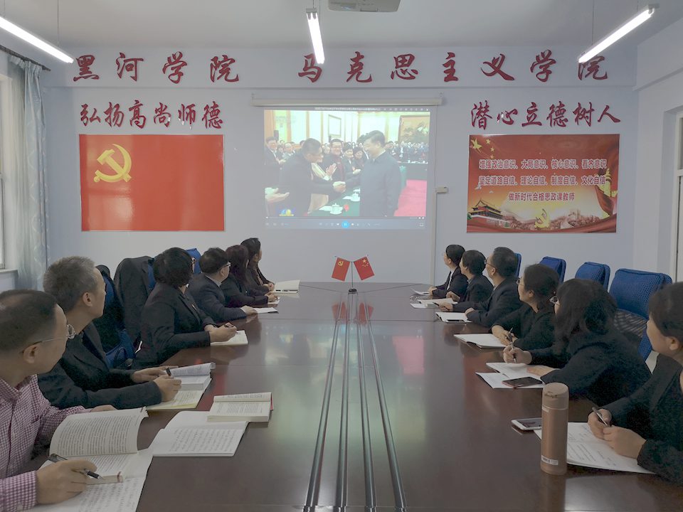 本网讯(特约记者 张萌)3月18日上午,习近平总书记主持召开学校思想政治理论课教师座谈会并发表重要讲话。马克思主义学院第一时间组织全体教师收看当晚《新闻联播》报道,建立“思政微讲堂”学习交流群,及时上传学习资料。3月20日下午,马克思主义学院全体教师在求知楼B109会议室集中学习总书记的重要讲话精神。