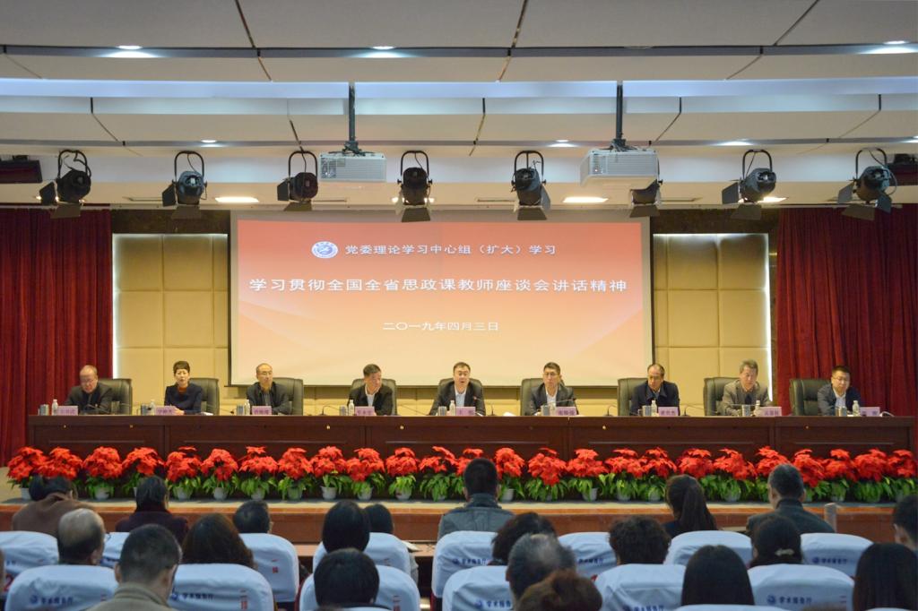 本网讯(记者 赵宇 摄影 关月)4月3日,学校召开党委理论学习中心组(扩大)学习会议,学习贯彻全国全省学校思想政治理论课教师座谈会讲话精神。学校党政领导班子,各部门负责人、各学院党总支书记、学团办主任、辅导员、班主任,学生工作部全体成员及马克思主义学院全体教师参加学习。会议由党委委员、副校长张焕强主持。