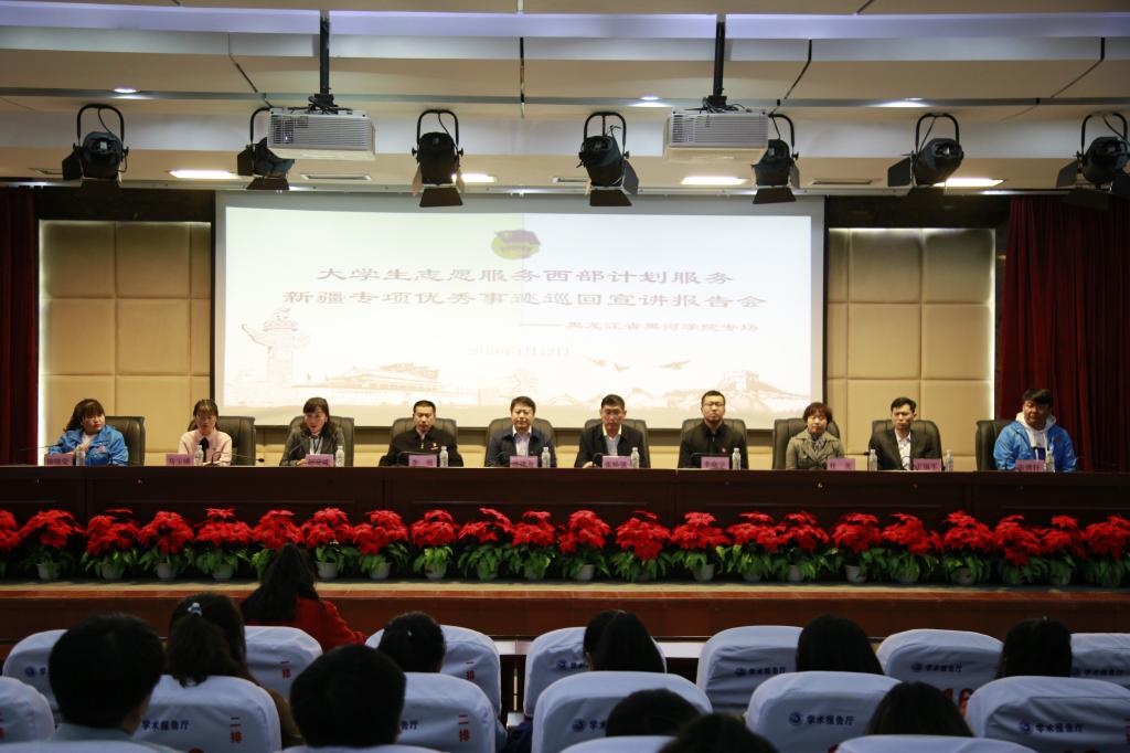 本网讯(特约记者 潘潇 摄影 程旺 吴越洋)为做好2019年西部计划招募宣传动员工作,鼓励我校毕业生报名参加大学生志愿服务西部计划,4月12日下午,学校特邀新疆自治区团阿勒泰地委副书记李晓宇一行几人组成的西部计划志愿者宣讲团,在学校求知楼报告厅举行“西部志愿行奉献新时代”2019年大学生志愿服务新疆专项优秀事迹巡回宣讲会。共青团黑河市委副书记孙建龙;学校副校长张焕强,招生就业处处长杜英,学生工作部部长李明,校团委书记王福军、副书记赵晓娜,各学院辅导员及2018届毕业生代表400余人参加宣讲会。宣讲会由校团委副书记赵晓娜主持。
