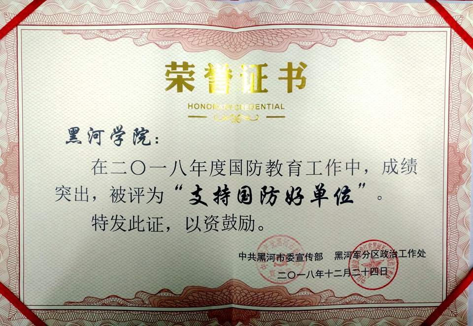 4月26日,黑河市全民国防教育领导小组工作会议在军分区会议室召开,表彰了在国防教育工作中涌现出的先进单位和个人,我校被中共黑河市委宣传部和黑河军分区政治工作处评为“支持国防好单位”。近年来,学校党委高度重视国防教育工作,将军事理论课列入教学计划,定期举办国防教育讲座,强化新生入学军事训练和国防教育,广泛开展征兵宣传,鼓励大学生应征入伍,国防教育工作始终走在全省高校前列。