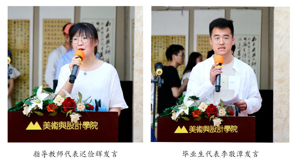 指导教师代表迟俭辉说,今天参展的作品是同学们百日深耕的成果,绘画作品既关注时代,也关注传承;设计作品既关注社会问题,也在探讨商业价值,希望毕业生们能够带着终身学习的理想,一路凯歌、自由幸福。毕业生代表李敬潭在发言中说,学校中外联合、产教融合、学做结合的特色人才培养方式,不仅夯实了学生们的专业基础,也为他们提供了展示学习成果的平台。他表示,自己会铭记“明德 笃学 励志 求真”的校训,不忘初心,奋力前行。