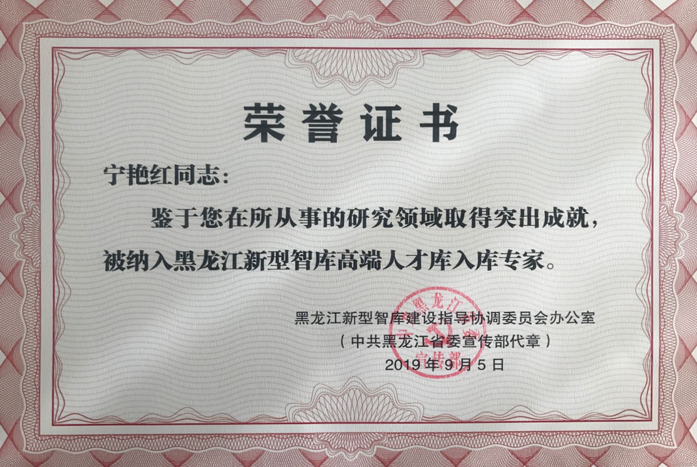 近日,黑龙江新型智库建设指导协调委员会办公室下发通知,经个人申报,组织推荐和遴选审核,报请中共黑龙江省委宣传部部务会议审定通过,经公示无异议后,确定我校宁艳红研究员为黑龙江新型智库高端人才库入库专家,并实行动态管理。