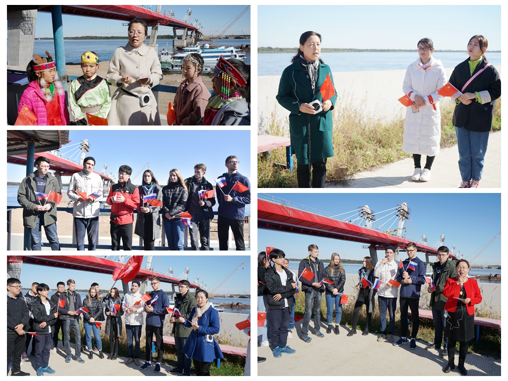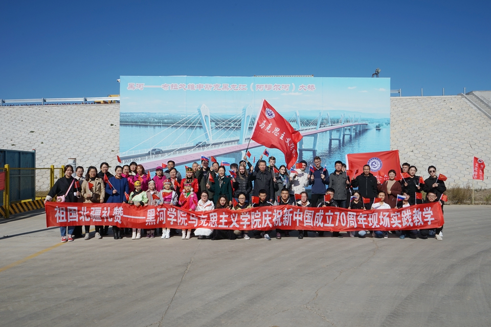 本网讯(记者 赵宇 实习记者 贾春杨)为庆祝新中国成立70周年,落实习近平总书记在学校思想政治理论课教师座谈会上的重要讲话精神,让中外学子走出课堂了解国情省情,切实提高我校思想政治理论课的教学效果,9月19日,马克思主义学院在黑龙江大桥现场组织开展了以祖国北疆礼赞——“不忘初心、牢记使命”庆祝新中国成立70周年思想政治理论课现场实践教学活动。副校长丛喜权与我校50余名师生代表、青年马克思主义社团成员、留学生代表、黑河民族小学不同民族的师生代表共同参加了活动。