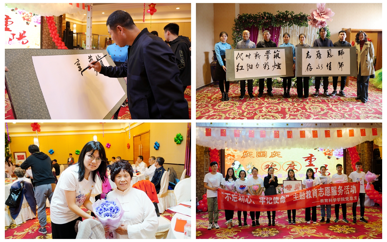 美术与设计学院党总支师生为离退休教职工现场书写祝福;教育科学学院党总支学生党支部党员为离退休教职工送上剪纸画和手工花。联欢会在全场齐唱《歌唱祖国》的歌声中圆满结束,台上台下相互辉映、其乐融融,呈现出一派温馨祥和的美好画卷。本次联欢会,充分抒发了我校离退休教职工为祖国祈福、为自己喝彩的良好祝愿,展示了离退休教职工热爱生活、乐观向上的精神风貌。