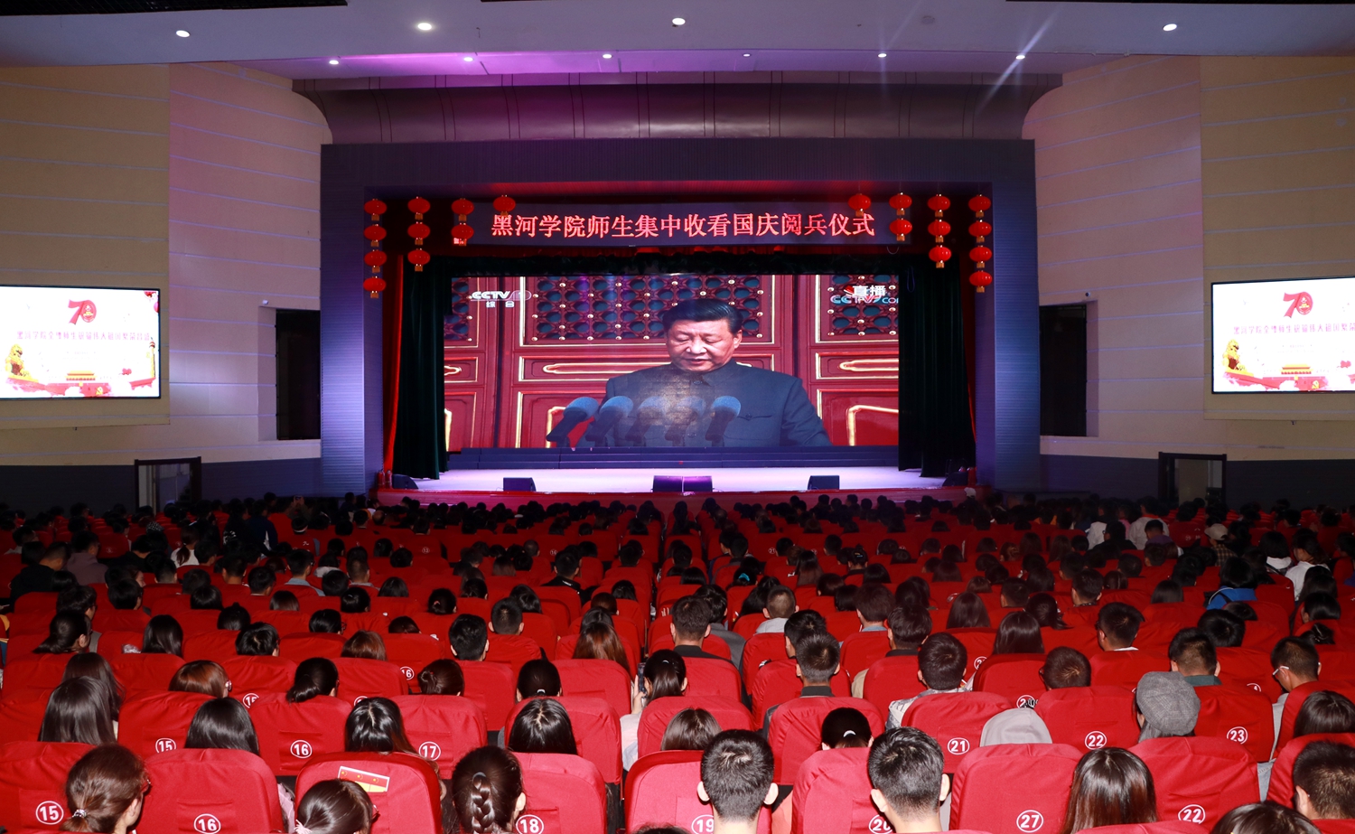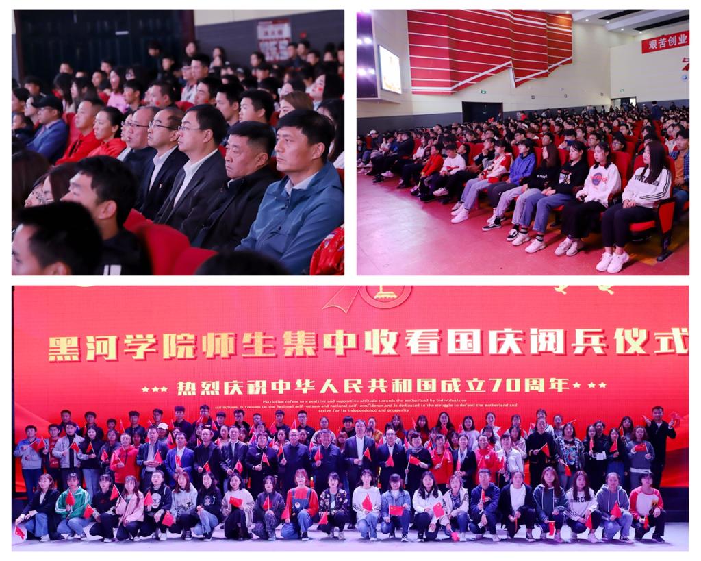 早晨8:00分,学校明德楼主会场便涌来了千余名前来观看庆典的师生,等待着和全国各族人民,与海内外中华儿女一起共享这个激动人心的时刻。10时整,伴随着党和国家领导人走上城楼、天安门前礼炮鸣响,会场内掌声雷动,当主持人宣布全场起立升国旗时,千余名师生全部整齐地起立致敬,伴随着五星红旗冉冉升起,雄壮的国歌声响彻荧屏内外,每个人脸上都充满了庄重肃穆。