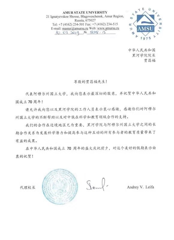 信中表示,黑河学院与阿穆尔国立大学的长期合作关系,为科学发展、教育提升带来有益成果,希望两校进一步加深合作,在学生交流、学术及教学交流等多方面再创辉煌,祝福两校的合作源远流长。
