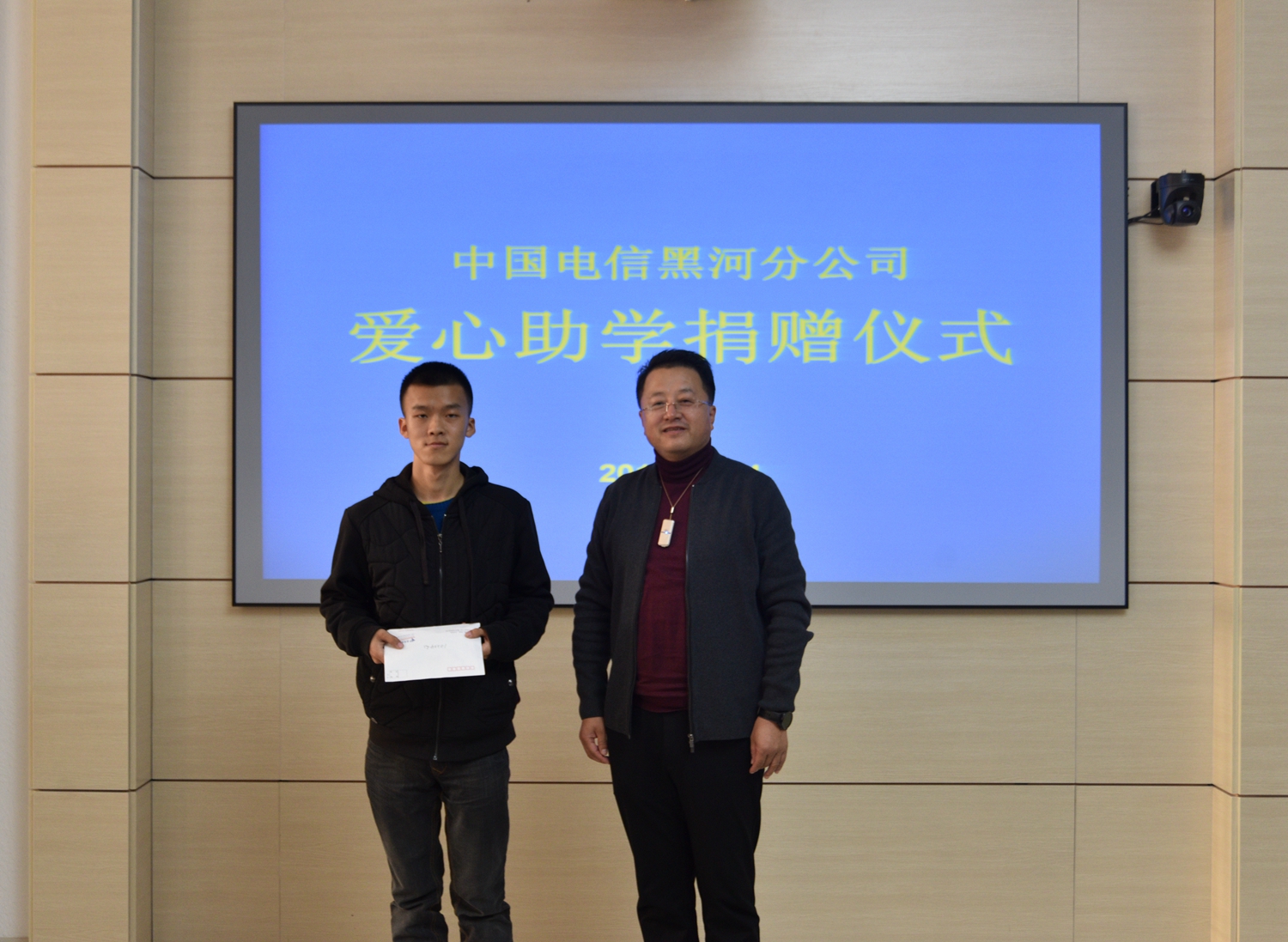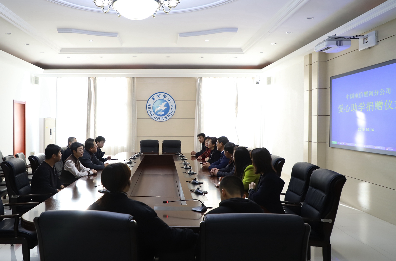 本网讯(记者 关月 摄影 李佳)10月14日,中国电信黑河分公司爱心助学捐赠仪式在我校举行。中国电信黑河分公司总经理霍彬一行5人,我校党委副书记张焕强,学生工作部、文化旅游学院相关负责人及受助学生参加捐赠仪式。