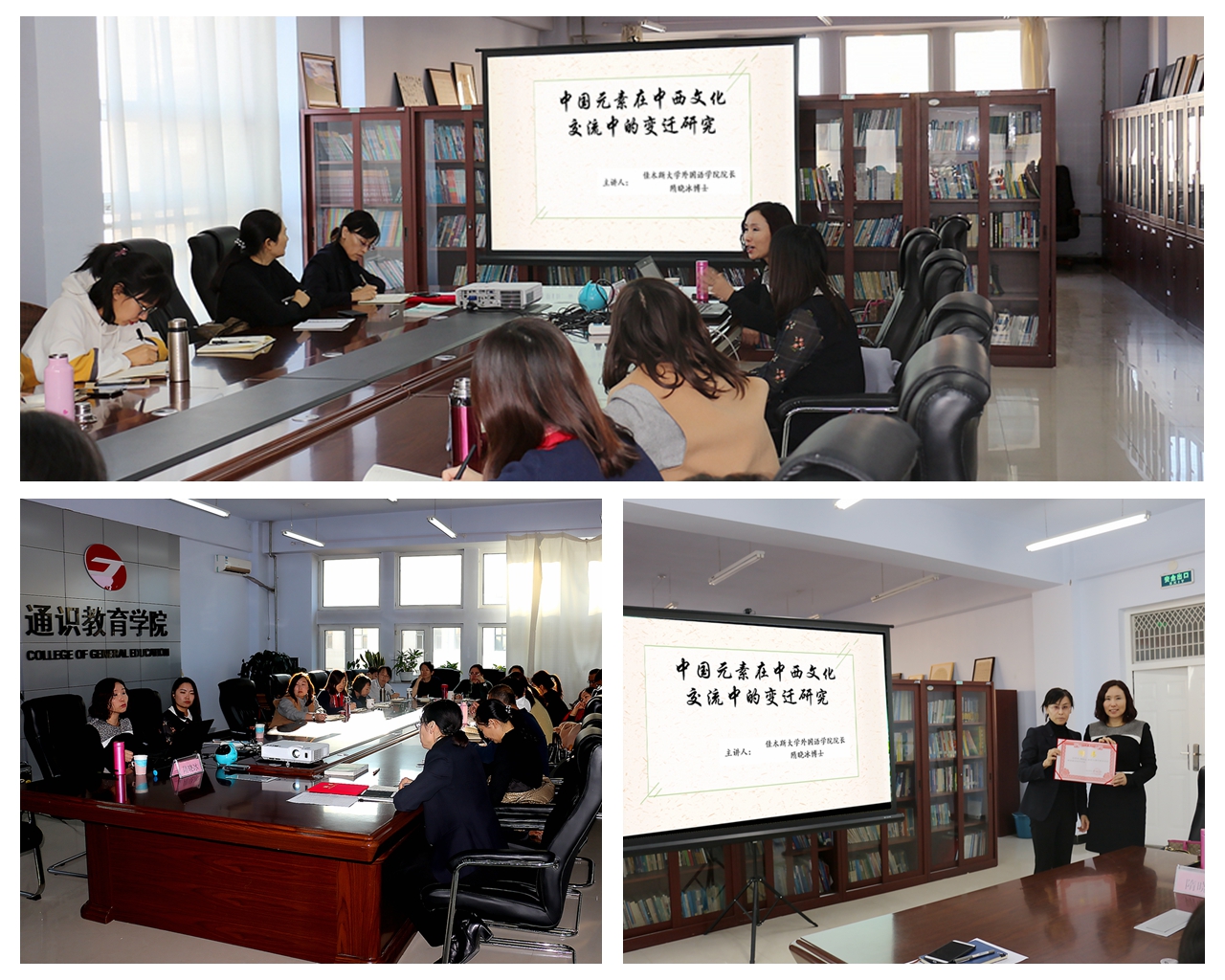 10月14日下午,通识教育学院聘请黑龙江省普通高等学校大学外语专业指导委员会副主任委员、佳木斯大学外国语学院院长、硕士生导师隋晓冰教授来我校作题为“中国元素在中西文化交流中的变迁研究”的学术报告。本次报告着眼于中国元素在中西文化交流中的变迁与发展,突出科研兴教和信息技术时代的高校课程内涵建设。报告内容旁征博引,深入浅出,资料详实,切合实际,获得了与会教师的一致好评。会后隋晓冰教授与全体教师结合课程思政、立德树人和“五个一工程”进行了深入交流与研讨,并聘请隋晓冰教授为通识教育学院课程建设指导专家,助力通识教育学院进一步完善课程研究与教学的规范化、专业化和信息化,提升科研服务教学效果与质量。