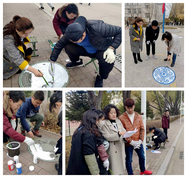10月的黑河天气微寒,但师生们热情高涨,围坐在井盖旁,商讨绘画方案、仔细清洗井盖、细笔勾勒轮廓、精心调配颜料,一笔一划,一气呵成,一个个以“北疆蓝”为主色调,立足黑河城市特色、充满地域风情、勾勒少数民族特色的美丽图案跃动于井盖之上。通过师生们创作换了“新衣”的井盖,瞬间变得明艳鲜活起来,绚丽的色彩点缀着校园,更温暖着师生们的心,驻足围观的师生纷纷拿出手机,记录大学校园美丽一角,为这一抹亮色发出赞美与惊叹之声。