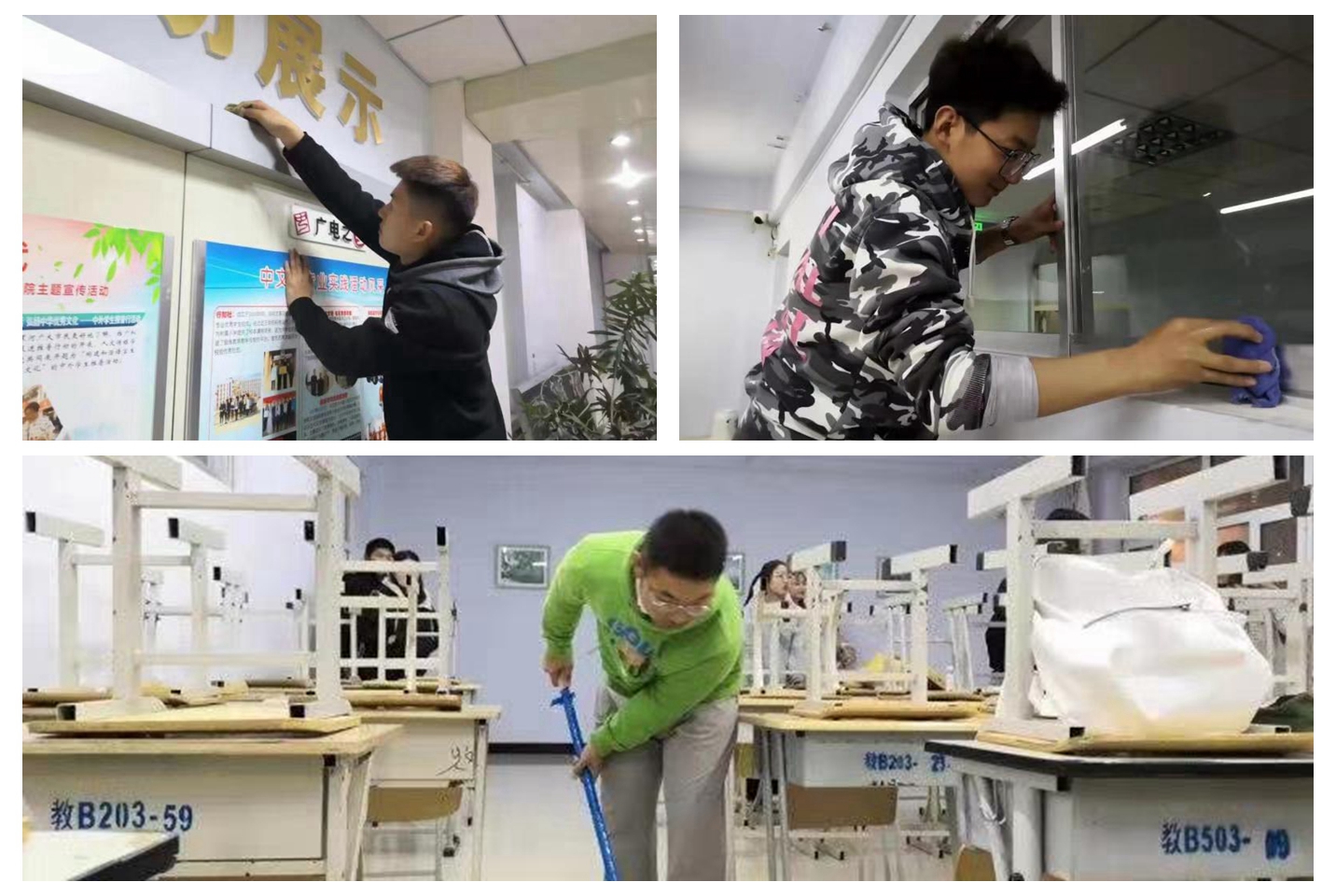 为进一步营造优美、洁净、舒适的工作及学习环境,10月22日晚,人文传媒学院组织开展了“不忘初心、牢记使命”主题教育秋季卫生大扫除志愿服务活动。活动中,学生志愿者们分工合作,对教室、走廊、卫生间地面进行清理,对教室门窗玻璃、讲台进行擦拭,对走廊等公共区域进行清洁消毒。