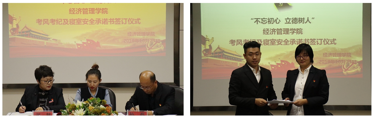 为进一步加强学生诚信教育、严格遵守考风考纪、增强寝室安全意识,10月22日,经济管理学院在求知楼B505会议室举行签订“不忘初心、立德树人”考风考纪及寝室安全承诺书仪式。经济管理学院院长谢慧和党总支书记孙磊与师生们共同学习了《黑河学院学籍预警管理办法》《黑河学院学生公寓管理规定》,强调了签订承诺书的目的、意义及重要性,并现场与辅导员、班主任、学生签订了《经济管理学院考风考纪承诺书》《寝室安全承诺书》。此次承诺书的签订是经济管理学院打造优良学风考风,加强宿舍管理,提高学生管理的具体举措,学生们一致承诺,将严格遵守考试纪律和公寓管理规定,争做合格大学生。