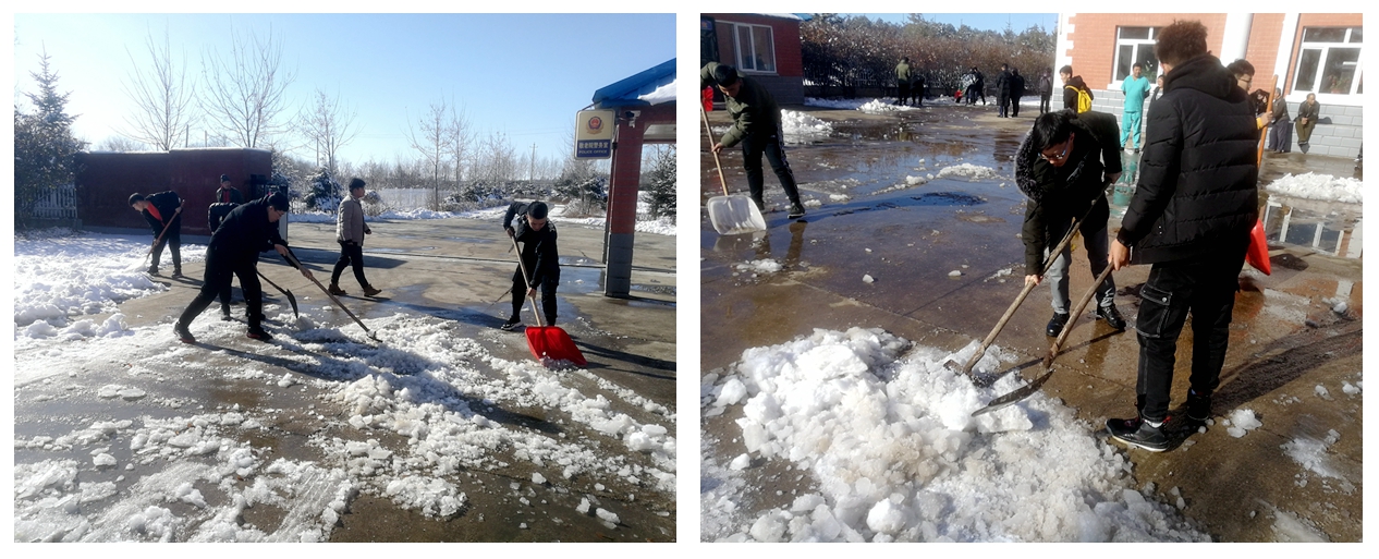 在26日的慰问演出结束后,同学们来到敬老院2号楼探望了孤寡老人,为老人们送上了水果等慰问品,并帮助敬老院清理积雪,同学纷纷表示,今后一定要常来看望爷爷奶奶,奉献爱心,回报社会,给老人带去更多温暖和欢乐。