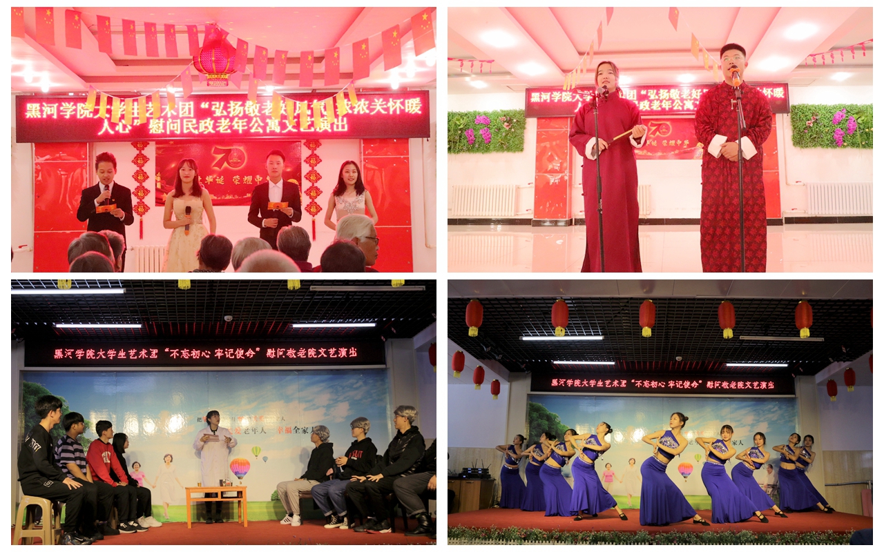 本网讯(特约记者 梁云婴)为弘扬中华民族尊老爱老传统美德,引导教育广大团员青年“不忘初心、牢记使命”。10月23日和26日校大学生艺术团的学生们分别来到黑河民政老年公寓和位于四家子乡的爱辉区中心敬老院开展敬老爱老文艺演出,为老人们送去温暖和关爱。