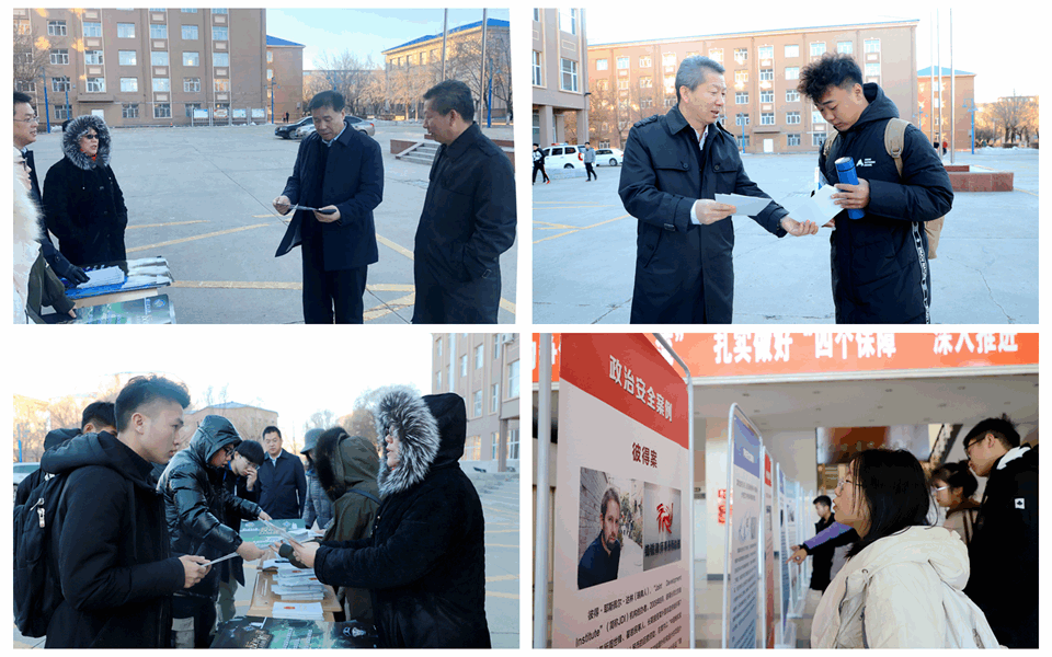 为进一步增强全校师生国家安全意识、法律意识和反间防谍意识,提高师生履行法律责任义务的自觉性,在《中华人民共和国反间谍法》颁布实施五周年之际,11月1日,我校组织开展了反间谍法宣传教育活动。校长贯昌福、副校长丛喜权与国际交流合作处、宣传统战部、学校办公室相关负责人参加活动。活动中,国际交流合作处与黑河市国家安全局联合在明德楼大厅设置了宣传板,通过剖析具体案例,对国家安全相关法律法规和隐蔽斗争进行详细讲解,并通过现场宣讲、发放海报和手册等宣传资料,向过往师生大力宣传、讲解《中华人民共和国反间谍法》相关知识,引导广大师生对反间谍法进行学习并提高国家安全意识,认真落实反间谍法宣传工作,提高守法、用法的能力,为保卫国家安全,维护社会稳定,构建和谐校园贡献自己的一份力量。