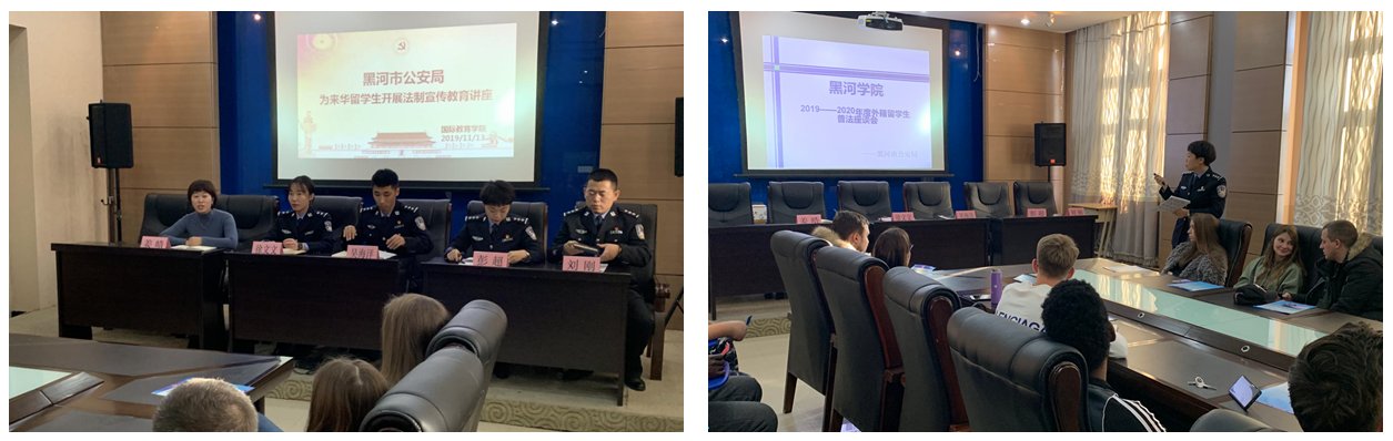 为切实加强学校来华留学生服务管理工作,进一步提升来华留学生知法懂法守法的意识和能力,11月13日,黑河市公安局出入境管理支队外事民警一行4人到校,为国际教育学院来自俄罗斯、蒙古、乍得、伊朗、乌克兰等国家的40余名来华留学生开展法制宣传教育讲座。讲座中,出入境民警们结合留学生的学习生活情况,用中英文宣讲了《中华人民共和国出境入境管理法》相关规定,着重对外国人签证延期、居留许可申请、住宿登记申报、证件使用等方面进行了详细讲解,并要求留学生们在中国学习生活期间,必须严格遵守我国法律法规。讲座结束后,民警们与来华留学生进行了互动交流,现场解答了关于签证、居留许可办理等方面的问题。留学生们纷纷表示,法制宣传讲座让他们能够更好地在中国知法、懂法、守法。