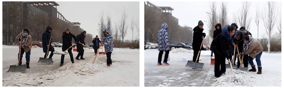 本网讯(实习记者 李佳 杨竹均)近日的冰雪天气给广大师生的正常工作学习生活带来了困难。路面光滑,师生们出行安全受到严重影响。在学校的教学楼、宿舍等不同场所,都留下了师生员工和后勤服务人员清雪除冰的劳动身影。