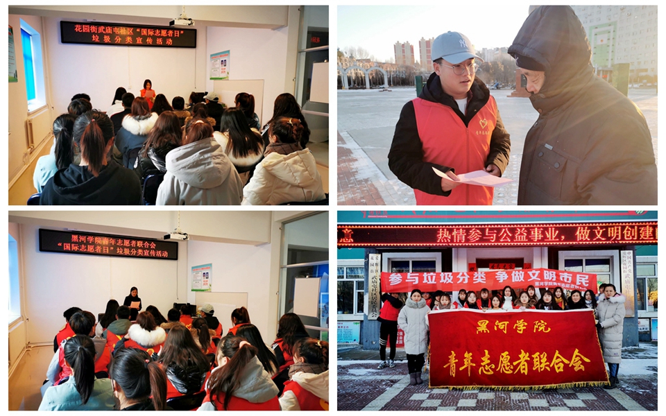 本网讯(特约记者 姜涛)为弘扬志愿服务精神,广泛宣传垃圾分类知识,12月5日国际志愿者日当天,我校青年志愿者联合会与爱辉区花园街武庙屯社区联合开展“国际志愿者日”垃圾分类宣传志愿服务活动。