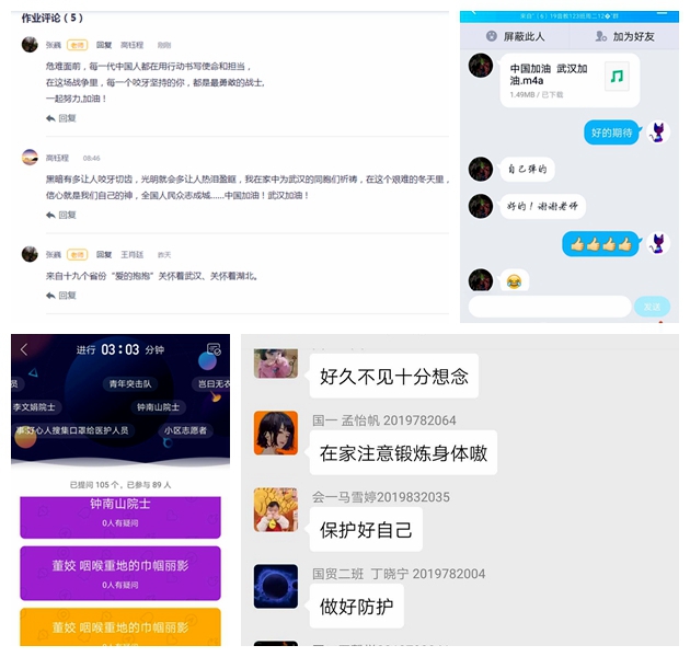 思政第一课得到学生积极回应,线上互动有序,课后作业踊跃提交。同学们用朴实的真情表达了居家防疫40天对同学、老师、学校的想念,用真诚的话语感谢抗疫一线医生的付出,用充满力量、充满希望的语言为武汉、为湖北、为中国加油!