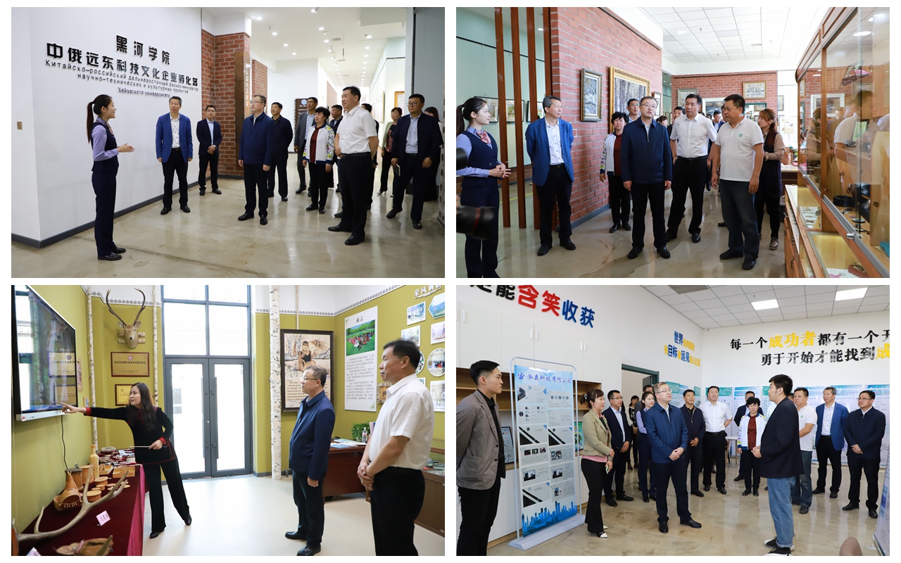 在中俄科技文化艺术产业园,马里书记一行先后参观了产业园部分区域,重点了解了我校美术与设计学院特聘教师、黑龙江省非遗项目桦树皮制作技艺传承人陶丹丹的民间工艺工作室、音乐学院鄂伦春民族音乐教师关志英的黑河市爱伦希科技有限公司和美术与设计学院教师作品展,马里书记对学校中俄科技文化艺术产业园的建设和运营给予了充分肯定,他强调,要进一步加大宣传力度,通过与媒体沟通合作等形式进行宣传推广,扩大产业园的影响力;要不断加强与中俄高校联系,依托自贸区的政策便利,发挥自身独特优势,实现文化艺术全产业链发展;要学习借鉴省内外优秀经验,多举办文化交流活动,搞活人流、物流,集聚更多人气,将产业园打造成为具有体验性、时尚性的黑河创新产业新地标;要进一步加强市校合作,深化产学研对接,实现市校共建双赢和共同发展,为促进黑河经济社会发展作出更大贡献;黑河市委市政府要力所能及地为产业园发展提供优质高效的服务,助推中俄科技文化艺术产业园做大做强。