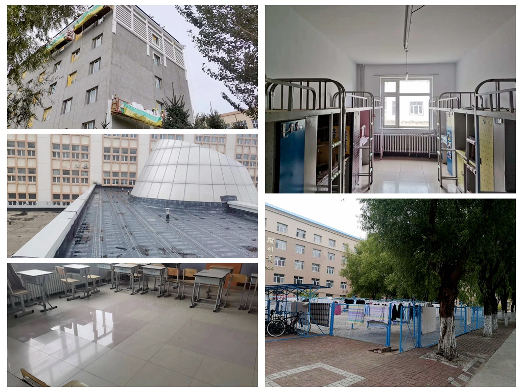 今年暑期美术二号楼三号楼防水工程、六号楼整体维修改造、求知楼造型屋面防水、友谊楼防水檐及造型维修、新生寝室粉刷、校内晾衣架座椅喷漆、室内地砖维修、校内楼宇外墙维修、校内步道板踏步理石维修、校内分类垃圾箱摆放、洗手液盒盘纸盒安装以及二食堂改造、体育馆维修改造、校内动力电改造,4号、6号学生公寓暖气管道改造等多项维修改造项目有序开展。