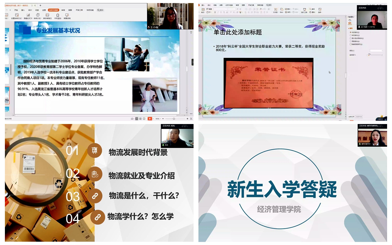会上,经济管理学院院长谢慧介绍了经济管理学院的专业分类、师资力量、教育教学、学科建设、师资队伍、人才培养等方面详情;经济管理学院副院长翟立强及各系副主任王小琬、李月秋、李成龙分别对国际经济与贸易、会计学、物流管理三个专业的人才培养目标、课程设置、专业发展等基本情况进行了讲解;教学秘书刘晗针对学籍预警等学业相关规定进行了讲解;学团办主任齐黎丽针对学校在学生管理和学籍管理、奖助学金评选等方面的规定进行了详细的梳理和解读;2020级辅导员康瑛泽对新生关心的“入校是否需要做核算检查”“如何利用微信缴费”“党、团关系转接”等十四个热点问题统一进行了讲解。与会教师针对现场新生及家长的问题进行了一一回答。