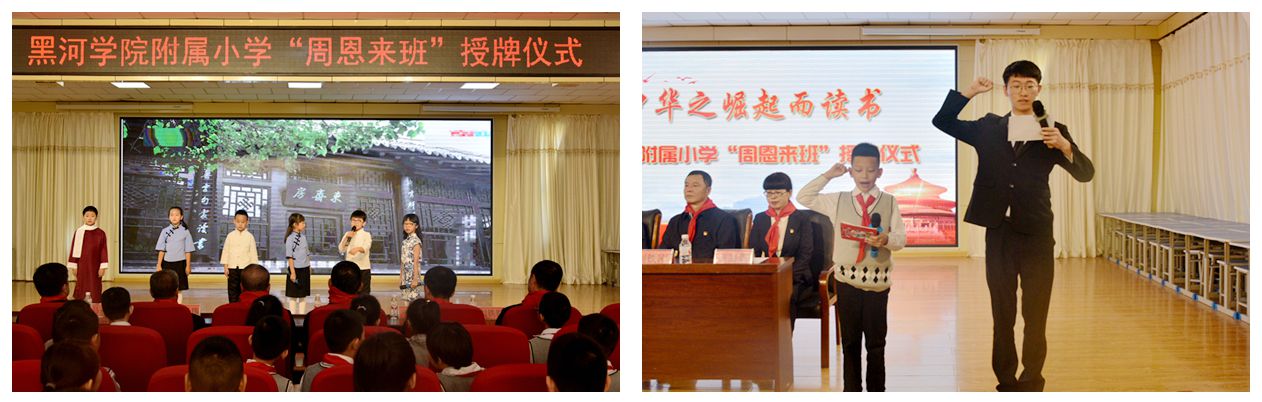 仪式期间,我校和附属小学“周恩来班”的学生代表发言、宣誓;附属小学3年3班的学生为大家表演了曾代表全省少年儿童在黑龙江省图书馆“我喜爱的童书”评选活动启动仪式上展演的课本剧《为中华之崛起而读书》。