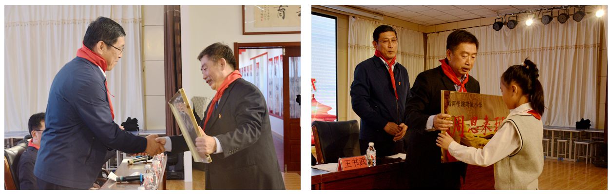 授牌仪式在周恩来总理的秘书纪东将军,周恩来母校南开大学周恩来政府管理学院的优秀校友赖志杰、乔丽楠,黑龙江省少先队总辅导员赵晓娜线上发来的寄语中拉开帷幕。王书武部长宣读授予黑河学院附属小学3年1班“周恩来班”荣誉称号决定;张焕强副书记为黑河学院附属小学授牌、马书彬校长为3年1班班长授牌;刘铁钢部长为小学“周恩来班”赠送书籍和影响资料。