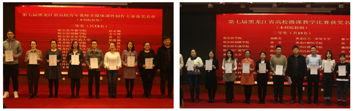 本网讯(特约记者 李娟)11月8日,黑龙江省高校师资培训中心和教育部全国高校教师网络培训黑龙江省分中心联合举办的“第七届黑龙江省高校微课教学比赛”和“第七届黑龙江省高校青年教师多媒体课件制作大赛”颁奖仪式在哈尔滨举行,我校四位教师获奖,学校荣获大赛优秀组织奖。