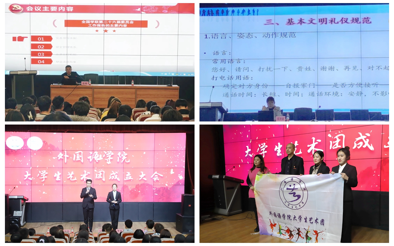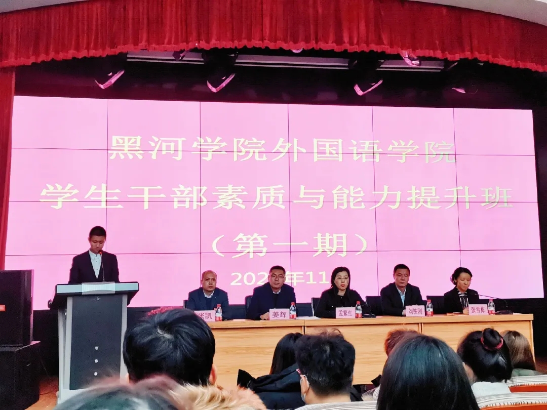 在11月2日举办的第一期学生干部素质与能力提升班上,院长孟繁红勉励全体学生干部要正确认识学生组织和学生干部的概念、差异和内涵,不断增强自身综合素质,以服务师生和更好地开展“自我教育,自我管理,自我服务”的“三自”管理目标,努力争做新时代有担当的学生干部。校团委负责人姜辉为外国语学院学生自律委员会、青年志愿者联合会、学生党员工作服务站及班级干部代表160余人做了题为“全国学联二十七大精神解读”的专题讲座,强调学生干部应牢记全心全意为学生服务的根本宗旨,切实增强学生干部的政治性、先进性和群众性,发挥好桥梁与纽带作用;11月3日,人文传媒学院梁洪润老师从个人仪容仪表、行为举止以及言语表达等礼仪细节方面作“学生干部的礼仪修养”专题讲座,使学生干部明确了树立道德信念,规范个人行为的重要性;11月22日,外国语学院在俄语楼小剧场举行了“大学生艺术团”成立大会,党总支书记张雪梅指出发展艺术教育是实施实践育人战略的一个突破口和切入点,她希望全体艺术团骨干成员在学好文化知识的同时,抓住机遇,在实践活动中锻炼成长,全面提升综合素质。