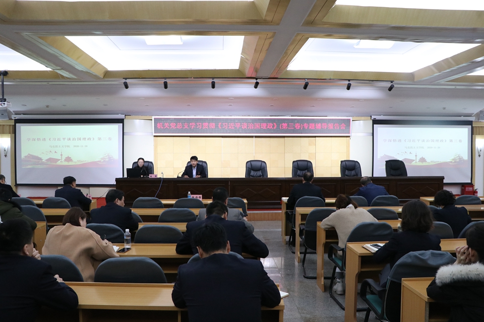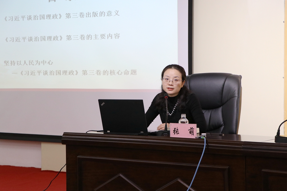 本网讯(记者 赵宇 摄影 杨倩)为深入学习《习近平谈治国理政》第三卷,进一步学懂弄通习近平新时代中国特色社会主义思想,提高机关党员干部思想政治素质和服务水平,11月26日,机关党总支特邀学校宣讲团成员、马克思主义学院张萌副教授为全体党员在明德楼五楼多功能厅作学习贯彻《习近平谈治国理政》第三卷专题辅导。报告会由机关党总支书记郑羽主持。