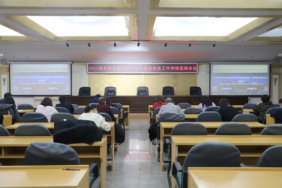 本网讯(记者 赵宇)12月1日上午,教育部召开2021届全国普通高校毕业生就业创业工作网络视频会议,我校在明德楼五楼多功能厅设立分会场,校长杨敬民,党委副书记张焕强,副校长许海深及教务处、学生工作部、校团委主要负责人,各学院院长、书记、副书记和全体毕业班辅导员与招生就业处全体人员参加视频会议,认真听取会议精神。