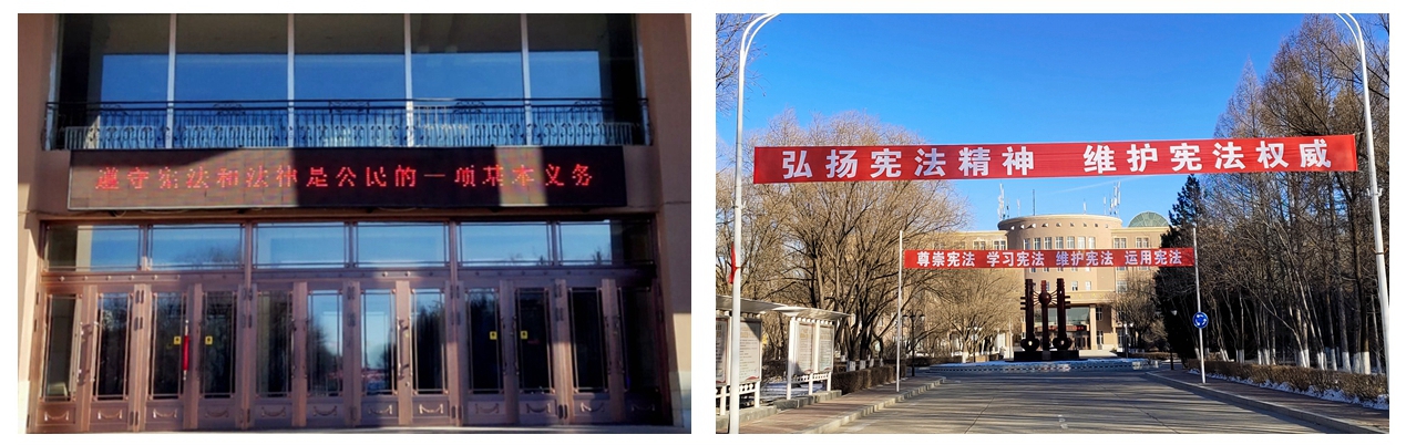 此外,党委宣传统战部充分利用舆论阵地,在校园主干道悬挂条幅,在明德楼主楼、教学楼LED电子屏滚动播放宪法宣传标语口号,利用宣传栏、宣传墙等宣传载体,悬挂张贴宪法民法典宣传挂图,大力宣讲宪法知识、宪法精神,突出讲好身边的法律故事,营造校园宪法文化氛围。