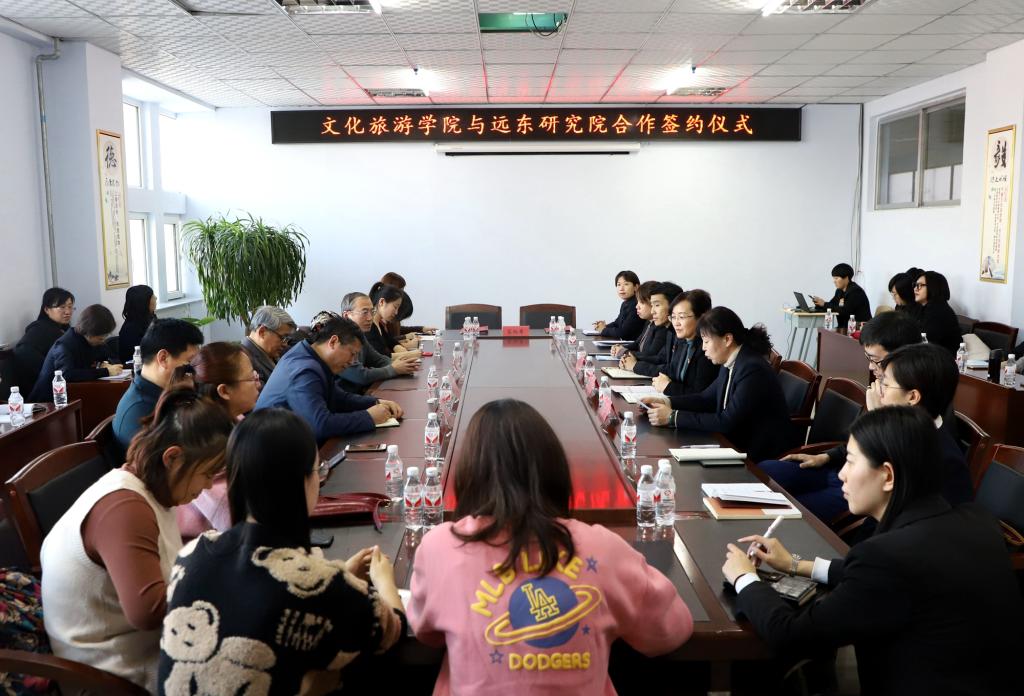 远东研究院院长谢春河与文化旅游学院院长潘华分别介绍了各自学院的基本情况、师资力量、科研情况和主要科研团队,并共同签署了合作协议书。潘华院长对双方即将开展的友好合作充满期待,她说,在学校积极谋划“十四五”发展规划之际,两院可以深化多方合作,携手共谋发展,努力搭建资源共享、优势互补的坚实平台,希望结合远东研究院的高水平科研力量,形成稳定的核心联合研究团队,促进两院教学、科研等各项工作更好更快发展。