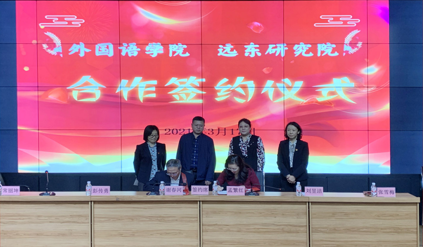 远东研究院院长谢春河与外国语学院院长孟繁红共同签订《黑河学院远东研究院与外国语学院合作协议书》,双方将在联合举办学术会议,共同邀请专家讲学,开展研究活动,加强学科建设和课程改革,推进历史文献、资料库资源、人才资源、科研成果、智库平台共享等方面深入开展合作,以期推动校内相关学科资源共享、优势互补协同发展。