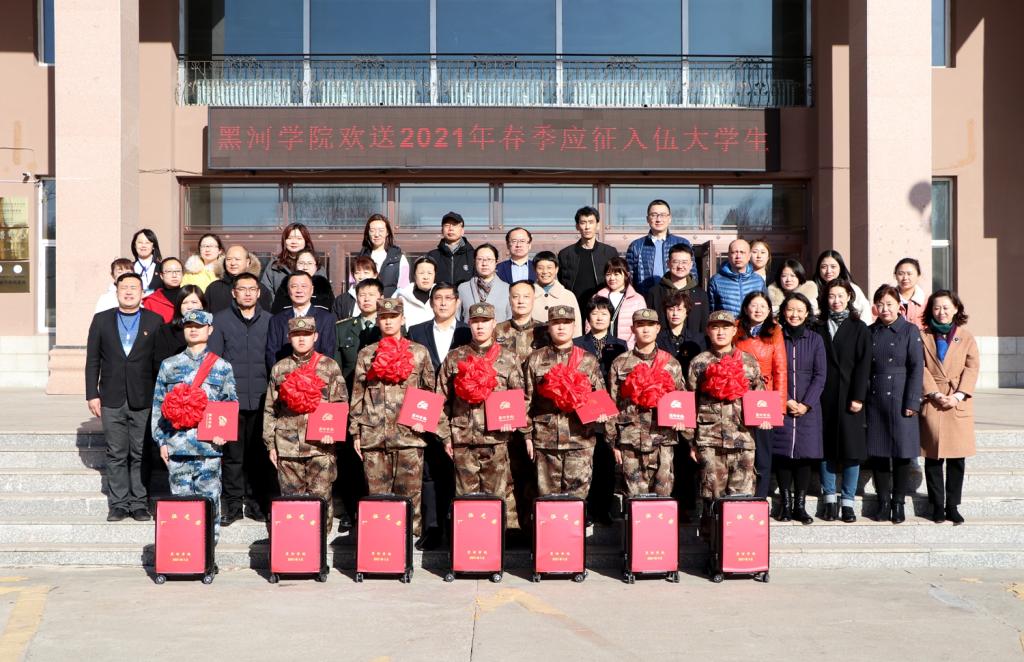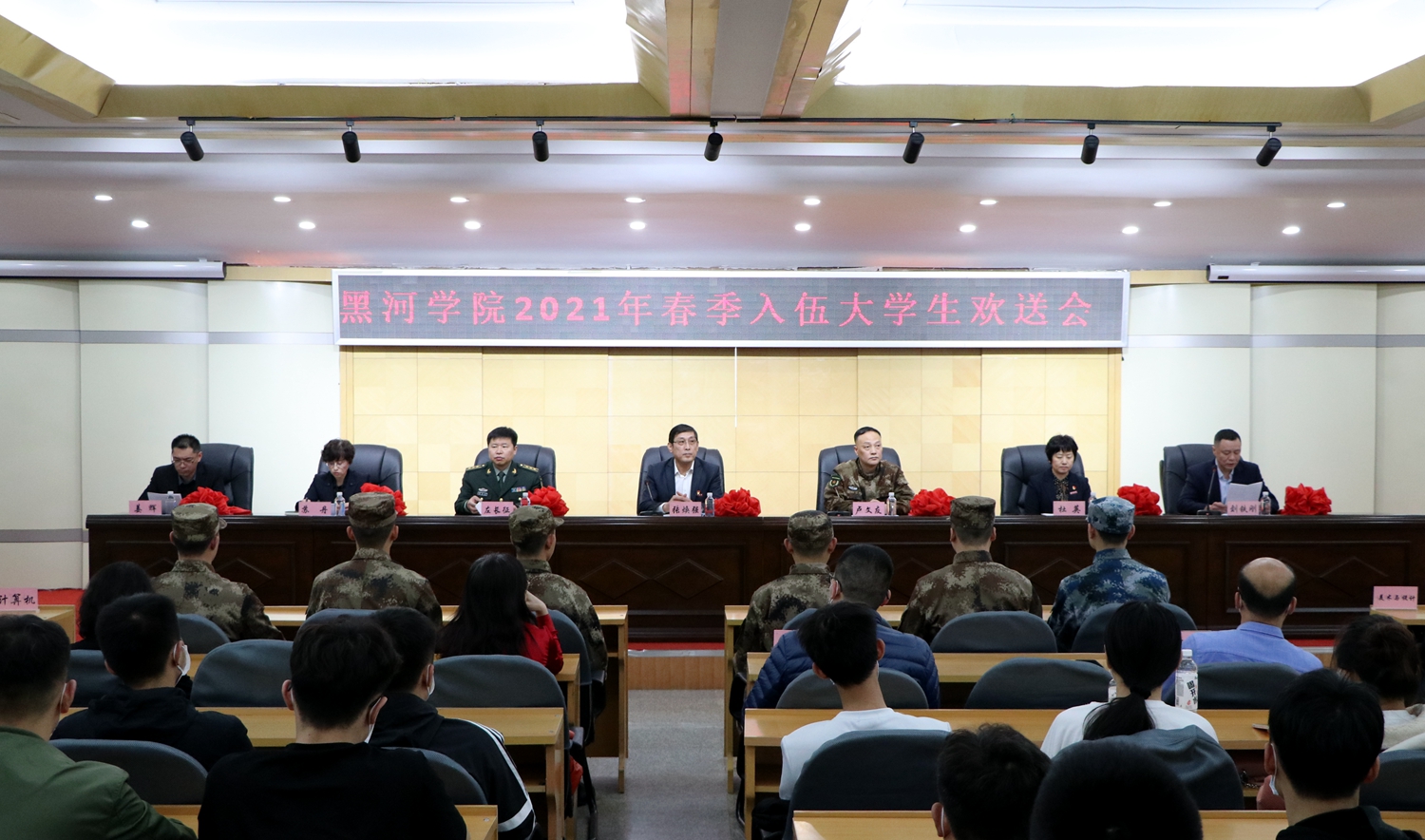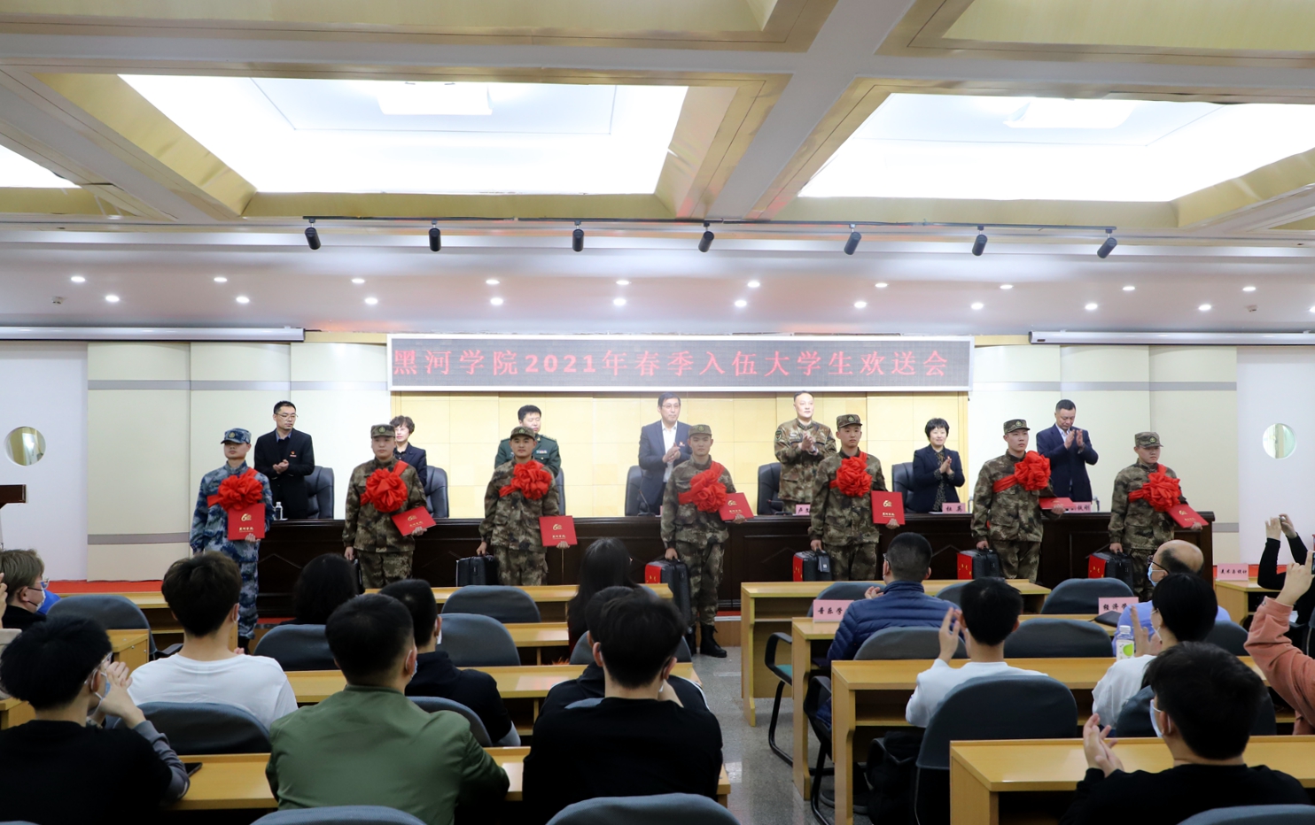 卢文友处长宣读了黑河学院2021年春季应征入伍学生名单;与会领导为通过政治审核和役前集训的7名应征入伍同学佩戴红花并颁发纪念品。