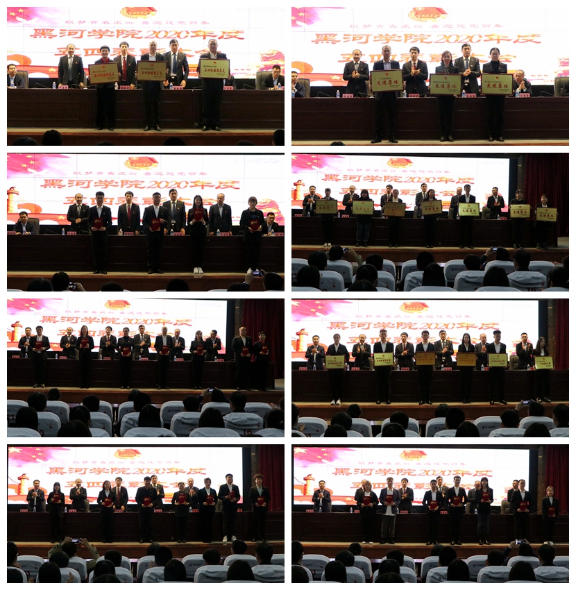 表彰大会在嘹亮的国歌声中拉开帷幕。百名新团员在团旗下庄严宣誓,与会领导为新入团学生佩戴团徽并赠送青年大学习笔记;团委副书记姜辉宣读《关于表彰黑河学院2020年度共青团工作先进集体和先进个人的决定》,与会领导为获奖先进集体、先进个人代表颁奖。
