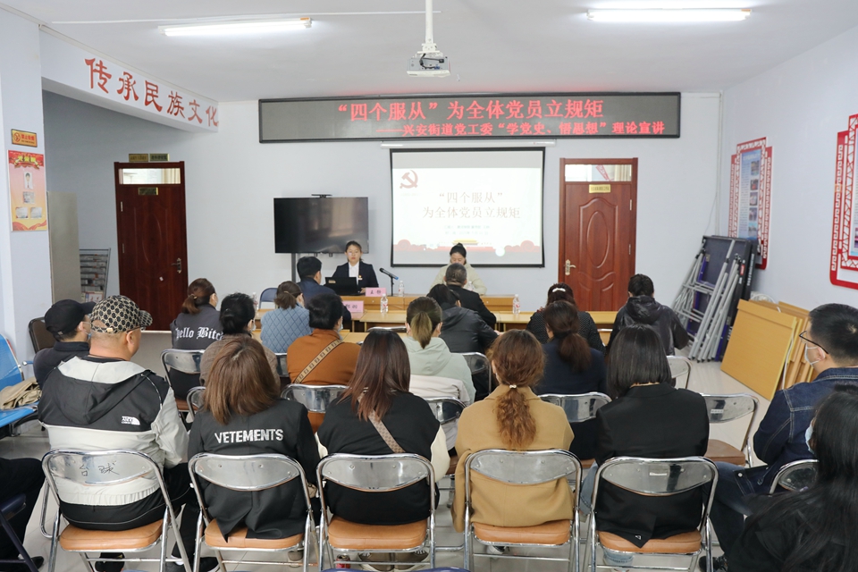 活动中,党委宣传统战部王静老师为机关党总支各支部党员代表、兴安街道党工委成员作了题为“‘四个服从’为全体党员立规矩”的党史宣讲,详细阐述了“四个服从”产生的历史背景、主要内涵、党员干部如何做到“四个服从”,引领党员干部从党史中寻找初心与使命,达到学史明理、学史增信、学史崇德、学史力行的要求,进而增强“四个意识”、坚定“四个自信”、做到“两个维护”。