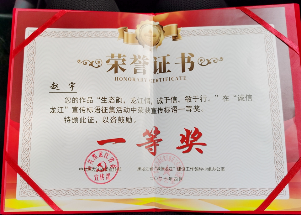 近日,由中共黑龙江省委宣传部、黑龙江省诚信办(黑龙江省营商环境局)联合举办的公开征集“诚信龙江”宣传标语活动结果揭晓,我校党委宣传统战部教师赵宇撰写的《生态韵 龙江情 诚于信 敏于行》获得宣传标语一等奖。本次征集活动旨在共建、共创、共享“诚信龙江”品牌形象,不断提高我省社会信用体系建设的知晓度和认同感。活动共征集宣传标语1317件,经初评、网络投票、复评等环节,最终评选出一等奖1名,二等奖5名,三等奖10名。