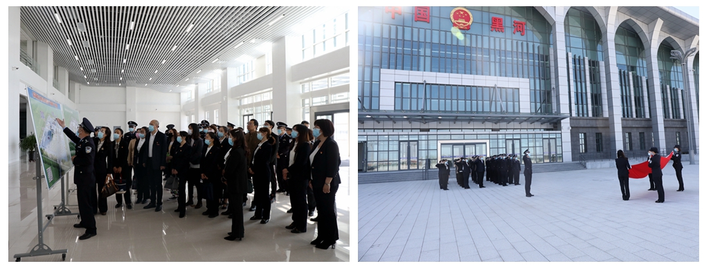 教师党员们抵达大桥口岸后,听取了黑河出入境边防检查站相关负责人对口岸出入境边防检查工作流程和职业特点的介绍,了解了智能验证台、自助查验通道等边检设备基本用途,通过查验流程、跨境救助、绿色通道等边检服务中一个个鲜活的例子,使教师党员们对边防检查工作有了更深入的认识。在大桥口岸联检大厅前,面对着鲜红的党旗,外国语学院党总支的教师党员和黑河出入境边防检查站边检处党支部的党员们共同重温了入党誓词。