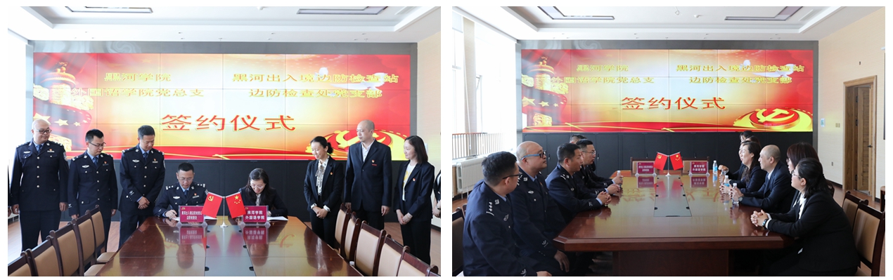 本网讯(记者 赵宇 摄影 周春晓)为发挥警民共建优势,深化警地党组织联建联创,以党建共建推进更深层面的合作交流,在纪念中国共产党成立100周年之际,5月21日,外国语学院党总支和黑河出入境边防检查站边检处党支部联合开展“建党百年同欢庆,铭记历史守初心”主题党日活动,签订共建协议。