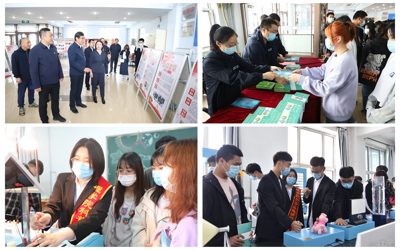 与会领导共同按动辉光球,启动“喜迎建党百年,人与自然和谐共生”学党史、办实事、科普周活动;黑龙江省黑河生态环境监测中心工作人员为学生们发放《医疗废物应知应会小知识手册》《四类环保建设对公众开放宣传手册》,普及环保小常识。