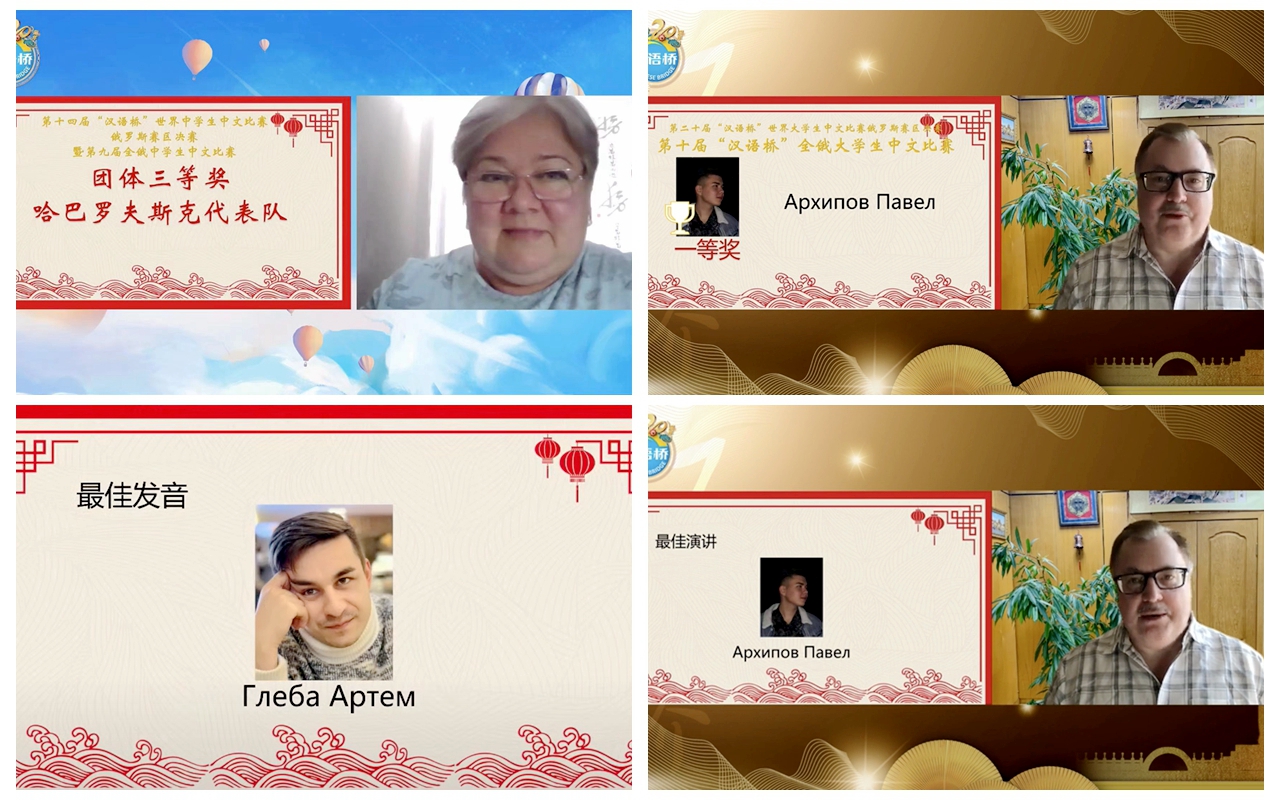 本网讯(特约记者 王晓梅)6月19—20日,由中国驻俄罗斯使馆教育处主办的第十四届“汉语桥”世界中学生中文比赛俄罗斯赛区决赛暨第九届全俄中学生中文比赛网络选拔赛、第20届“汉语桥”世界大学生中文比赛俄罗斯赛区决赛暨第十届全俄大学生中文比赛在线上落下帷幕。孔子学院教师指导参赛的中学生选手玛丽亚·亚历山德罗夫娜和沙塔洛娃·阿娜斯塔西娅获得 “团体三等奖”;大学生选手帕维尔·亚历山德罗维奇和格列巴·阿尔乔姆获得个人一等奖、最佳讲演、最佳发音奖三个奖项。